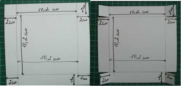 - Должна получиться крышка со стороной 10,2 см, которая плотно закрывает коробочку шириной 10см.