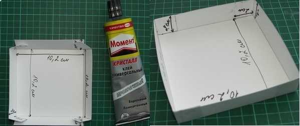 - У отрезанных ранее квадратов снять по краям по 2 мм и вклеить их внутрь коробочки на каждую из боковых стенок для увеличения их жесткости.