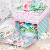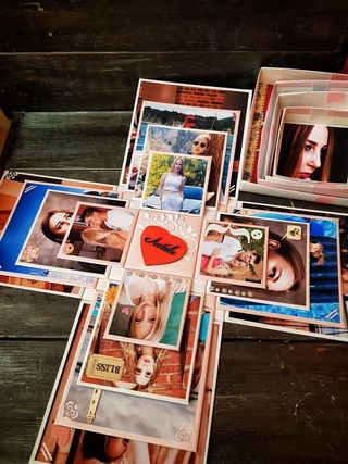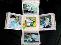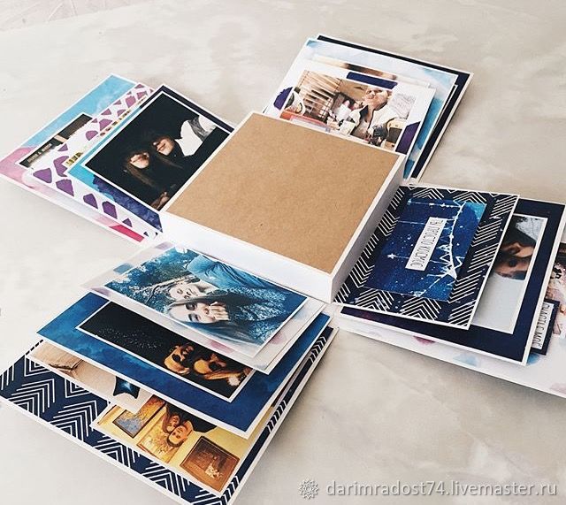 Следующая замечательная идея также выполнена в технике скрапбукинга. Коробочка с фотографиями своими руками делается следующим образом: