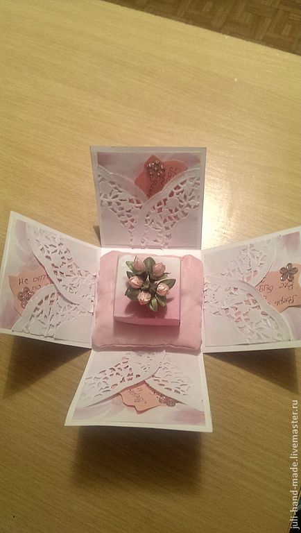 Затем поднимаем стороны коробочки и поверх надеваем крышку. Так же поступаем с остальными. В отзывах люди рекомендуют, собрав всю шкатулку с сюрпризом, перевязать ее лентой, чтобы не раскрылась раньше времени. Вот и все!