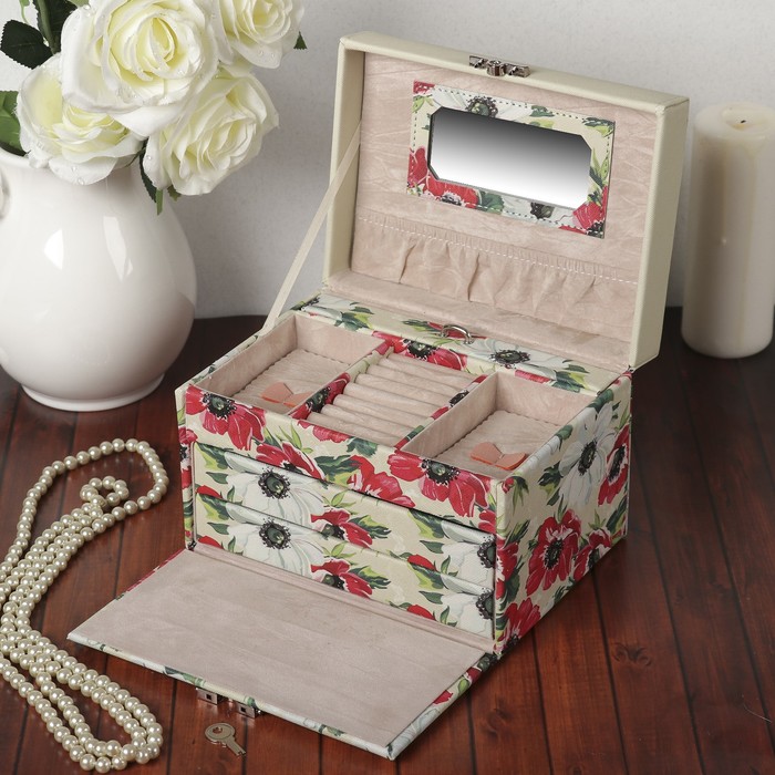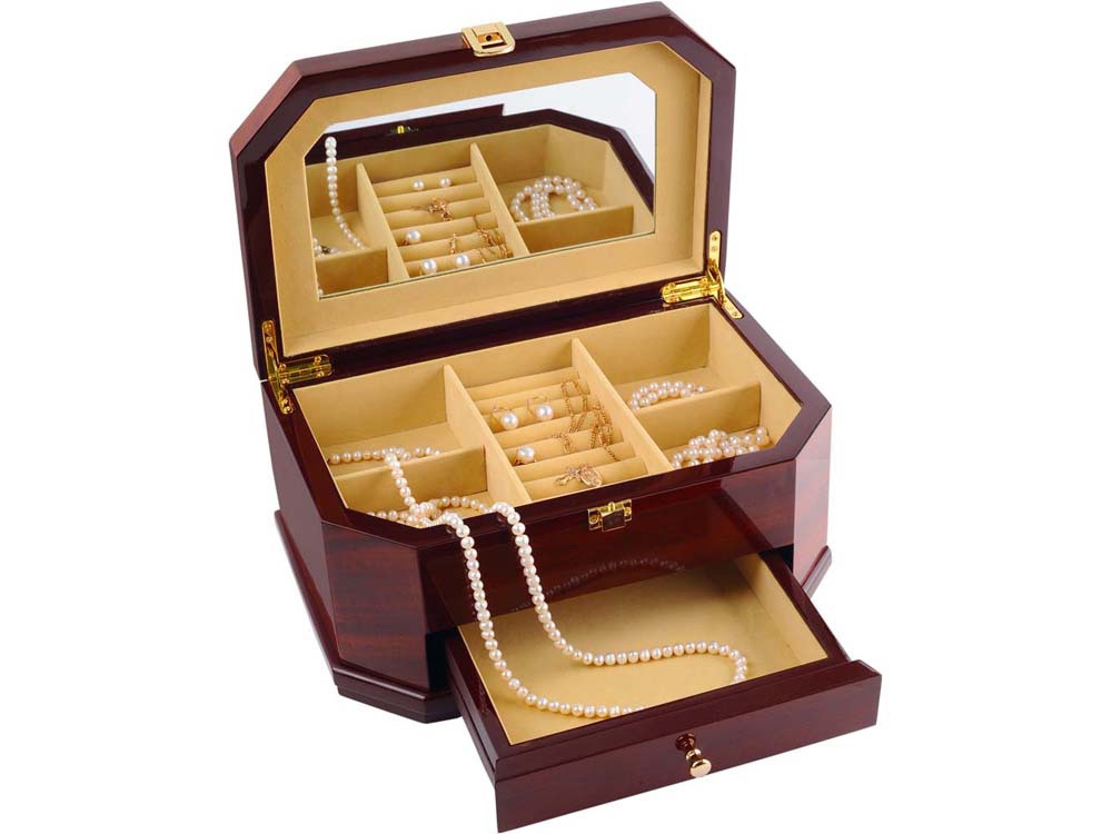 Обычно такие шкатулки имеют вид мини-комода, в котором отсеки располагаются в несколько этажей. Некоторые модели имеют ручку и напоминают небольшой чемоданчик. Такие изделия также могут закрываться на ключ. Это позволяет уберечь сокровища не только от грабителей, но и от детей, которые часто не понимают ценности золотых изделий.