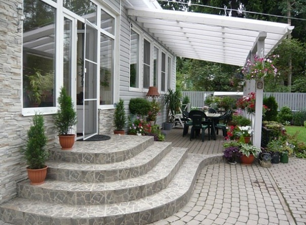 Натуральный камень является очень прочным, долговечным и красивым материалом для оформления крыльца. Существует много различных видов камня, одни из которых применяют для создания основания, другие — для декоративной отделки. Соответственное первые из них являются более дорогими и надежными, чем другие. В целом же, любой камень хорошо противостоит любым погодным условиям и не требует технического обслуживания в течение долгого времени.