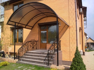 Такой вариант козырька будет большим, иметь представительный вид, для оформления нужны особо прочные стены; - поликарбонат – защитит от ветра и пыли, из-за его гибкости козырьку можно легко придать форму арки, шатра или зонтика, поэтому его так любят использовать дизайнеры.