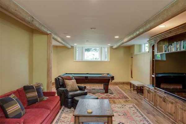 Комнаты с современной техникой также могут хорошо сочетаться с общим стилем деревянного дома. Попробуйте освежить их добавив яркие подушки из разных полос шерсти природных оттенков, как сделано в этой медиа-комнате, расположенной в подвале дома.