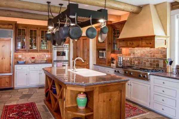Кухня — центр деревенского дома, она заменяла в старину и холл, и прихожую, и гостиную. Поэтому традиции почитания кухни сохранились и до настоящего времени. Эта комната должна быть светлой, потолки и стены в которой белят, оклеивают обоями с растительным или цветочным орнаментом. Можно воспользоваться современным материалом и отделать комнату деревянными панелями. Колорит придадут самовязанные половики, вышитое столовое белье, букеты из натуральных сухоцветов: пшеничных колосьев, душицы, зверобоя или пижмы. Посуду можно подобрать, выполненную дизайнерскими мастерскими, глиняную, керамическую или деревянную.