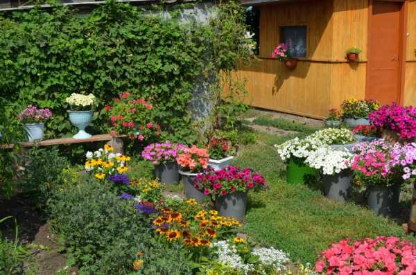 Кругом, кругом… Дом просто купается в цветах. Вазоны, ведра, большие кастрюли, кадки — все, что можно, использовано под цветы.