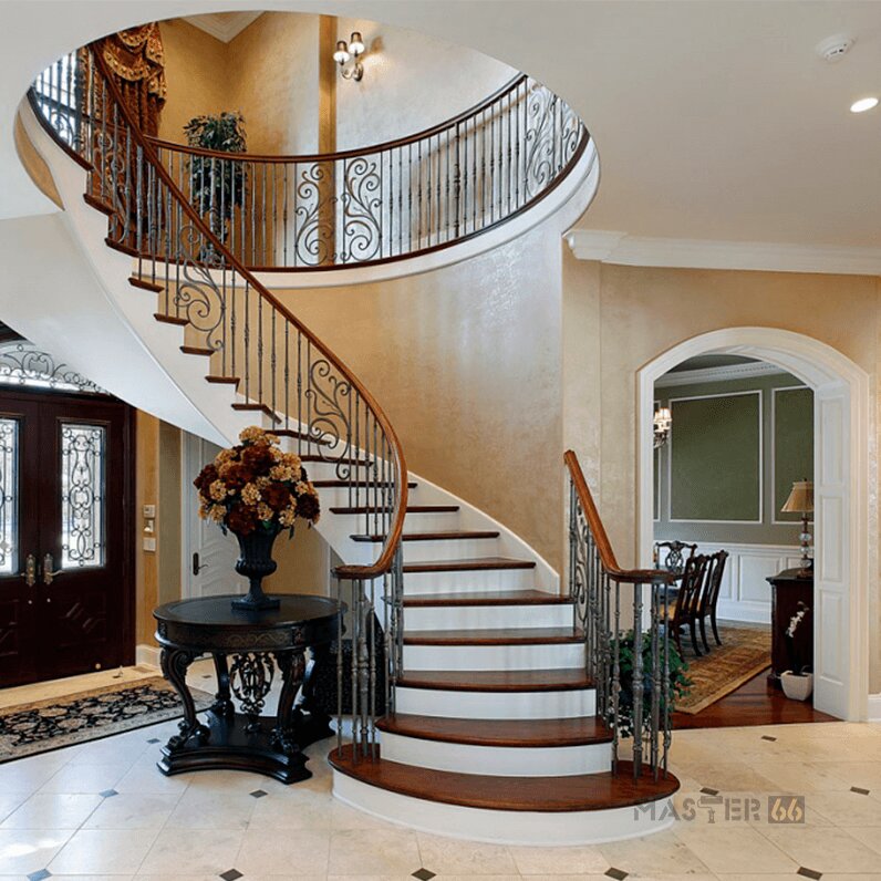 Один из самых сложных дизайнов, изогнутые лестницы, построенные с плавным изгибом в своей структуре, чтобы добавить уровень визуальной изысканности. Известные своим элегантным внешним видом, большинство изогнутых лестниц расположены в передней части дома, рядом с фойе, поэтому их можно увидеть при первом входе в дом.