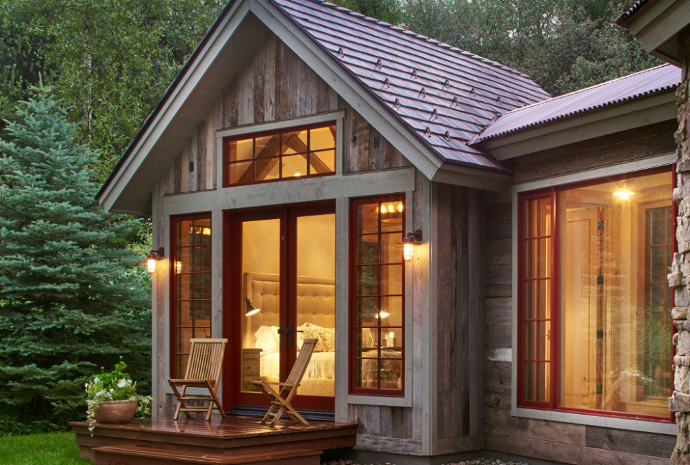 Этот дизайн берет классический загородный дом — цветочные ящики и все такое — и уменьшает его на несколько размеров. Внутри дома есть все необходимое, а также столешницы из мясных блоков, раздвижные двери сарая и удобный диван, что доказывает, что вам не нужно много квадратных метров, чтобы назвать это место домом, милым домом.