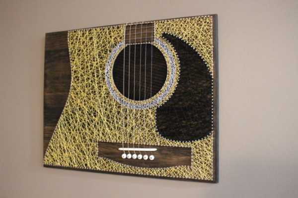 С помощью техники стринг-арт, которая предполагает создание композиций с использованием ниток и гвоздей, можно добиться уникального и неординарного оформления стен, формирующего нескучный и нетривиальный дизайн.