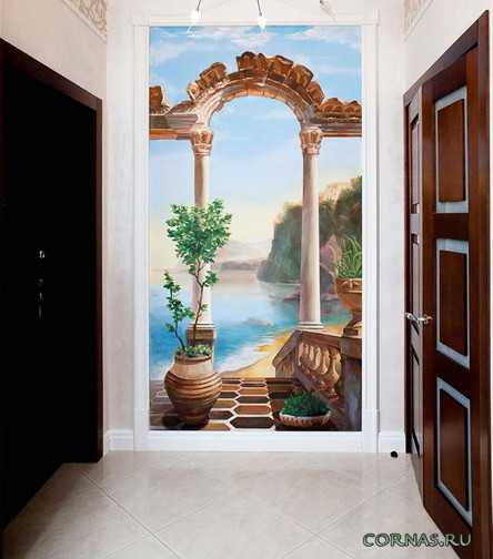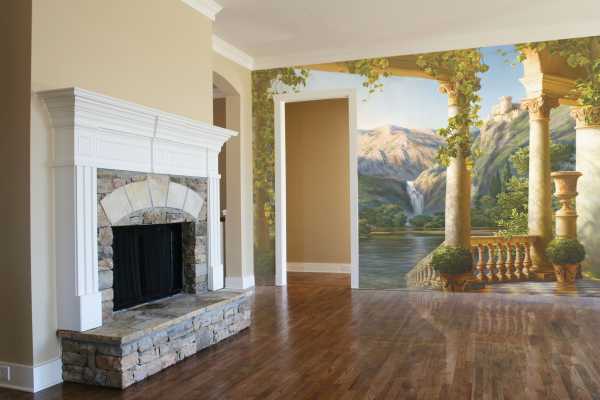 Довольно интересно смотрится отдельное панно, которое расположено в углу комнаты с изображенной на ней винтовой лестницей. Такая «обманка» как бы раздвигает границы и расширяет пространство. Но здесь главное правильно скомпоновать два вида панно в одном помещении, чтобы лестница не выглядела ненужным элементом в жилой комнате.