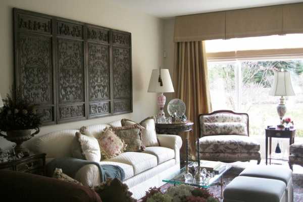 На фото резное деревянное панно прямоугольной формы на стене в интерьере гостиной.