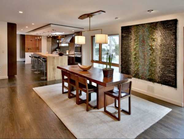 А в обеденной зоне возле стола можно повесить красивое панно из ткани или зерен кофе – такая «картинка» вполне соответствует назначению помещения. Людям с изысканным вкусом можно порекомендовать дополнить дизайн столовой настенным панно, выполненным с элементами резьбы по дереву.