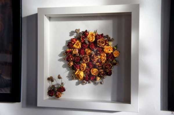 Сухоцветы, например бархатцы, астры, розы или маки, отлично сохраняющие свою природную форму после высыхания, довольно часто используются для создания декоративных панно, которые способны придать комнате определенной образности.