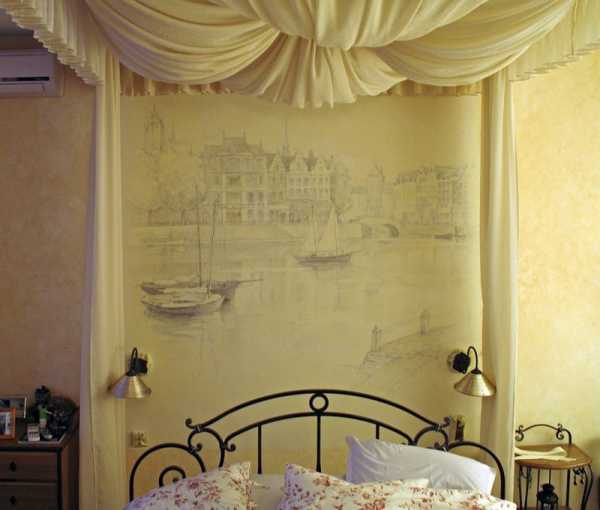 Для спальни выбирают классическое текстильное панно в виде цветов, ступенек в цветущий сад, морского берега или панно, имитирующее фреску.