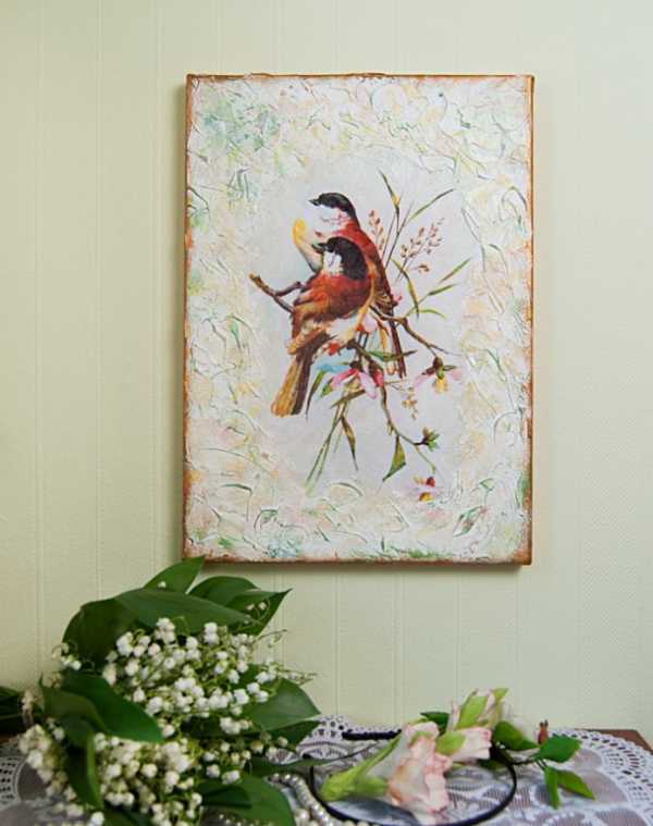Разнообразные вырезанные изображения, наклеенные на поверхность и покрытые несколькими слоями лака, прекрасно вписываются в интерьер и гармонично дополняют его.