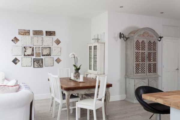 Самобытность, изящество, уют старинного французского деревенского быта может дополнить панно на стену в стиле прованс. Удачным материалом станет посуда. Посмотрите фото, где с использованием расписных тарелок, создана роскошная композиция. Здесь уместны, словно выцветшие на солнце, краски пейзажей, сочетающиеся с легкостью французского характера, растительные мотивы, грубоватые древесные элементы.
