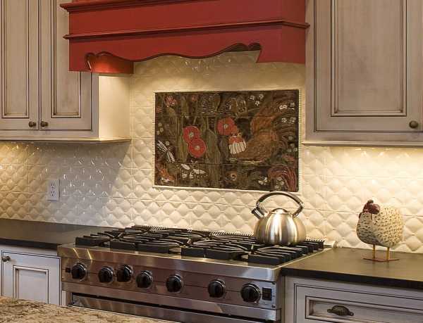 Панно из керамической плитки, безусловно, будет уместно возле рабочей зоны – у плиты или варочной поверхности, где часто готовится пища и невзначай появляются пятна на стене, а также в области кухонного фартука.