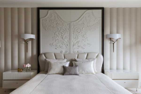 На фото небольшое прямоугольное панно из гипса, расположенное над кроватью в спальне.