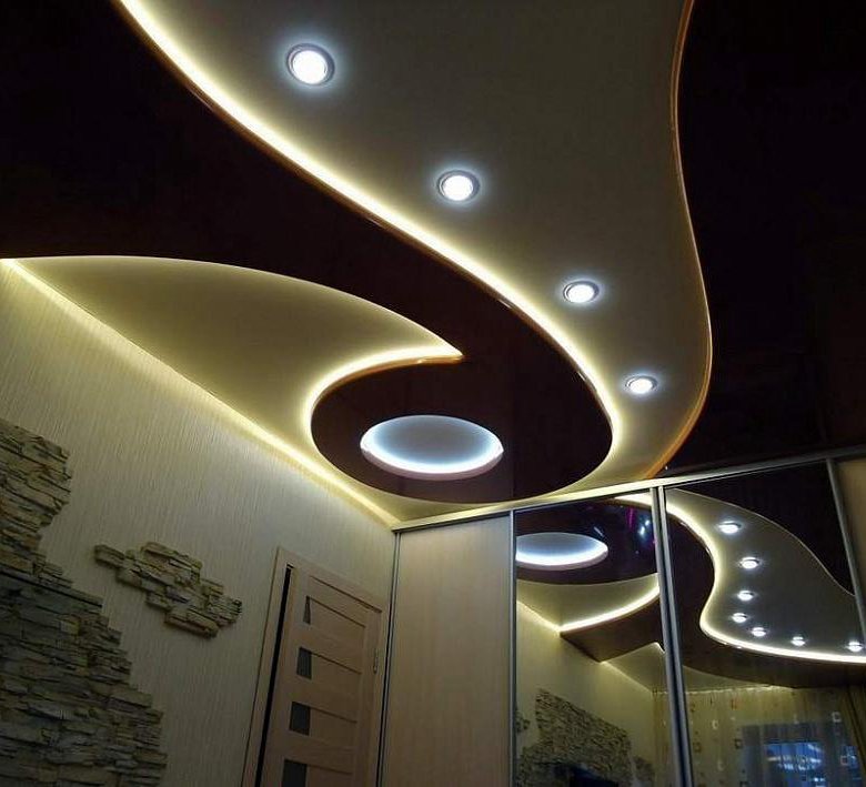 Встречаются одноуровневые, многоуровневые конструкции или вовсе фигурные, куда вмонтированы лампы.