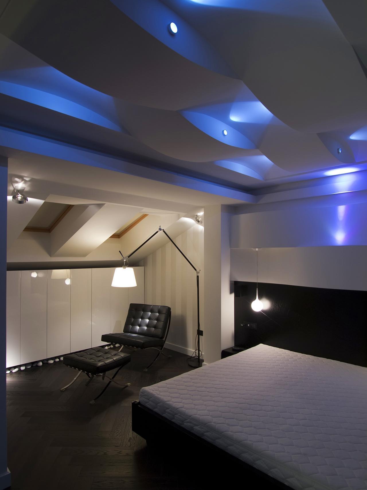 Приглушенная голубая подсветка потолка, переходящая на стену, весьма гармонично выглядит в интерьере спальни. Ничего лишнего, ничего кричащего, как раз для комнаты, где люди видят сны.