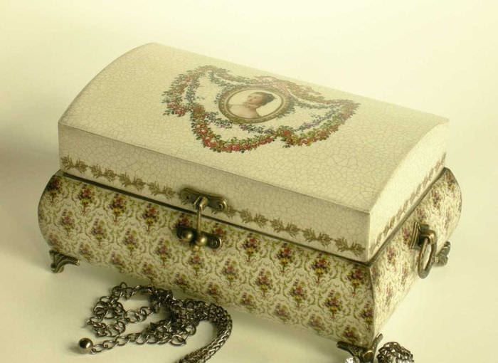 После просушивания изделия, его покрывают лаком. В данной технике приветствуется использование фотокарточек. Их предварительно избавляют от нижнего слоя. Украшать шкатулку можно не только с наружной стороны, но и во внутренней части.