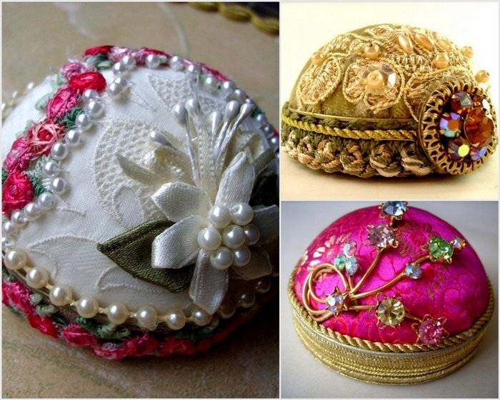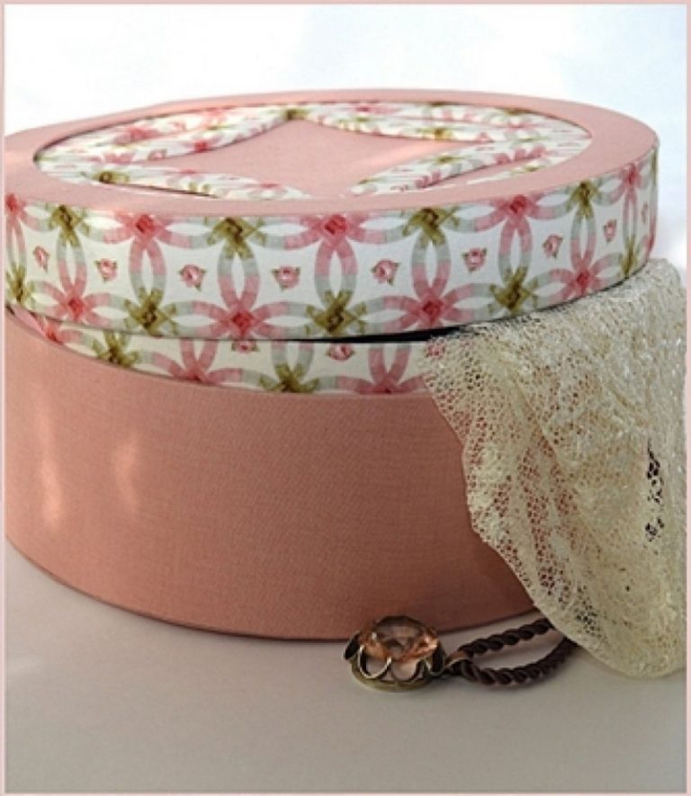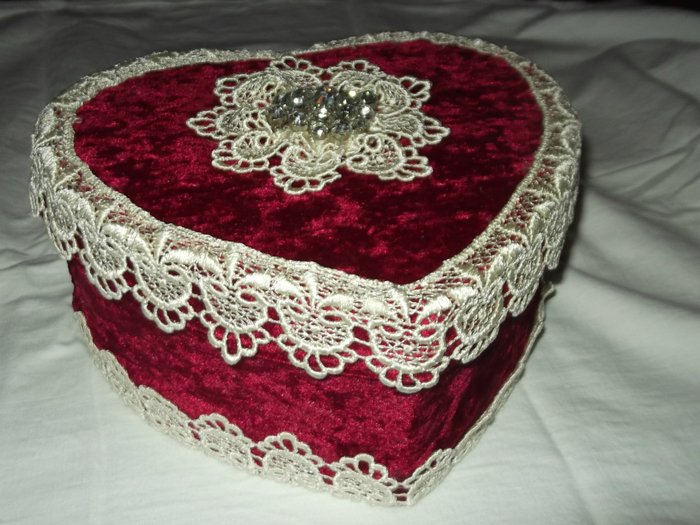Из бумаги и пенопласта следует вырезать формы для дна конфетной коробки. Затем обклеить коробку листом с узором. Далее нужно сформировать крышку из бумаги и ткани. Для этого можно взять готовую форму из пенопласта и обшить. После установки крышки, шкатулку декорируют различными элементами (бусами, кружевами и т.д.).