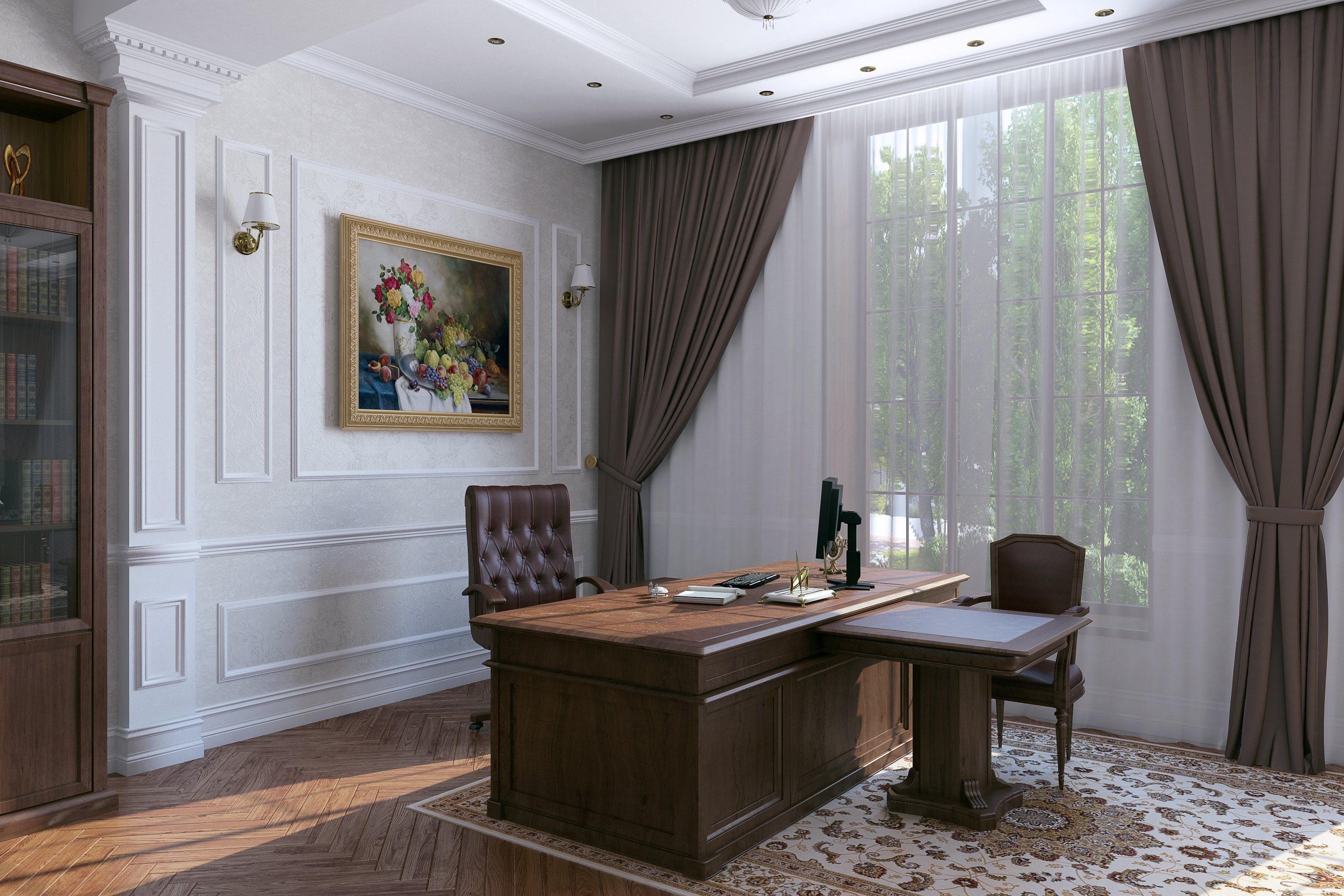 Идеально подходящими для отделки офиса директора предприятия или скромного начальства провинциальной государственной конторы являются бежевые оттенки. Они благородны, универсальны и практичны. Чтобы придать красивый внешний вид комнате, следует грамотно расставить акценты, правильно выполнить зонирование. Важным моментом при декорировании пространства являются шторы. Они заполняют большую площадь, поэтому могут сыграть ключевую роль в оформлении. Мужское или женское рабочее место легко создать. Необходимо только грамотно подобрать декор.