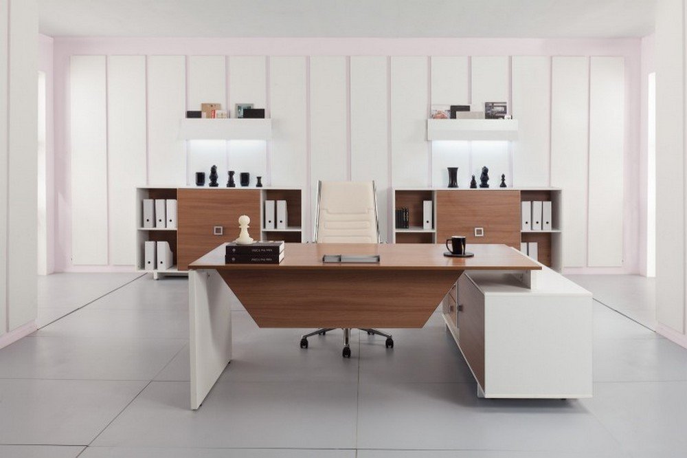 В первую очередь, необходимо заняться обстановкой рабочей зоны. Основным предметом в ней является функциональный и представительный стол из натурального дерева, который будет большим и комфортным.