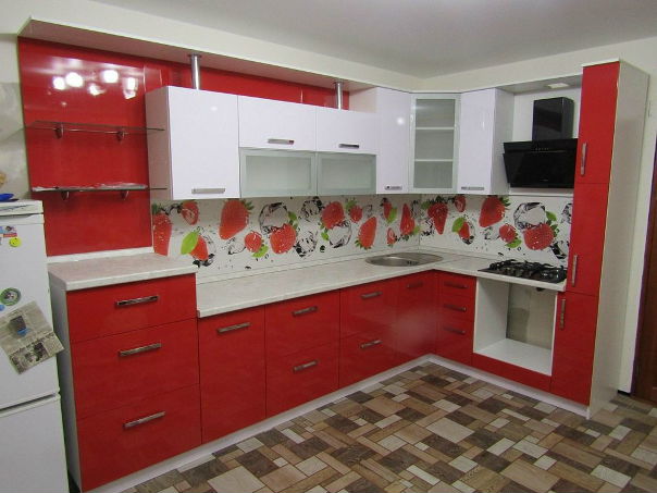 Такой вариант великолепно смотрится в стиле хай-тек или модерн. Красиво сочетается красный глянец и матовый белый цвет.