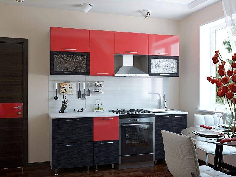 При небольших размерах комнаты лучше сделать всего один броский акцент, например, ало-черный шкаф. Остальную сочную гамму создать за счет светлых оттенков на фартуке, столешнице и прочего. Но если все-таки хочется расположить в кухне гарнитур со смоляными нижними фасадами и пламенным верхом, рекомендуется светлая отделка стен. Также обстановку разрядят стеклянные матовые фрагменты на дверках, блестящая поверхность фасадов, строгая, но современная фурнитура. Гарнитур должен составлять общую композицию, сочетаясь с остальными предметами обстановки.