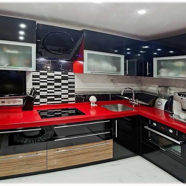 - белые фасады дополняются красной столешницей и черной отделкой или наоборот;