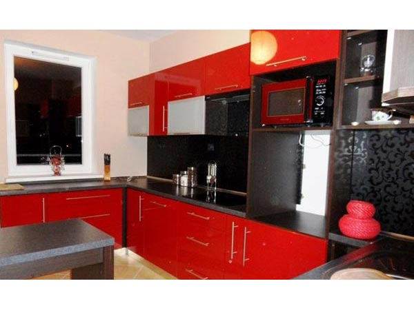 Подбирать правильный оттенок стоит исходя их габаритов помещения. Для больших просторных кухонь, площадью больше 20 квадратных метров можно использовать яркие красные фасады в комплексе с черной глянцевой столешницей.