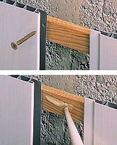 К стене монтажный профиль прикрепляется с помощью дюбелей. Ее конструкция позволяет просто прищелкивать панель к рейке с помощью специальных клипс, что облегчает монтажные работы. Использование такой конструкции позволяет в будущем быстро демонтировать стеновые панели для того, чтобы заменить поврежденные элементы.