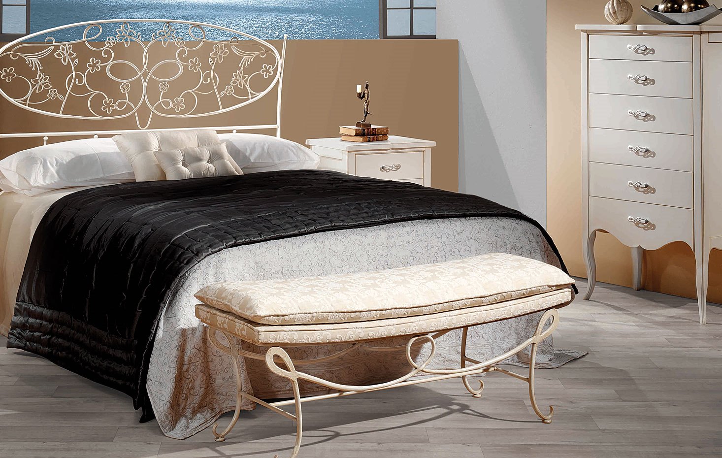 Она гармонично впишется в деревянную меблировку и пастельные тона отделки, а нежные завитки с растительным орнаментом на изголовье напомнят о духе романтической Франции.
