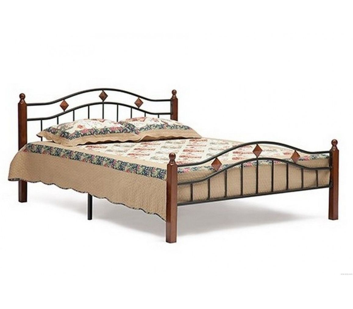 Востребованы модели кроватей, в которых сочетаются детали из древесины и кованого металла. В таких изделиях деревянная спинка дополняется ножками из аналогичного материала.