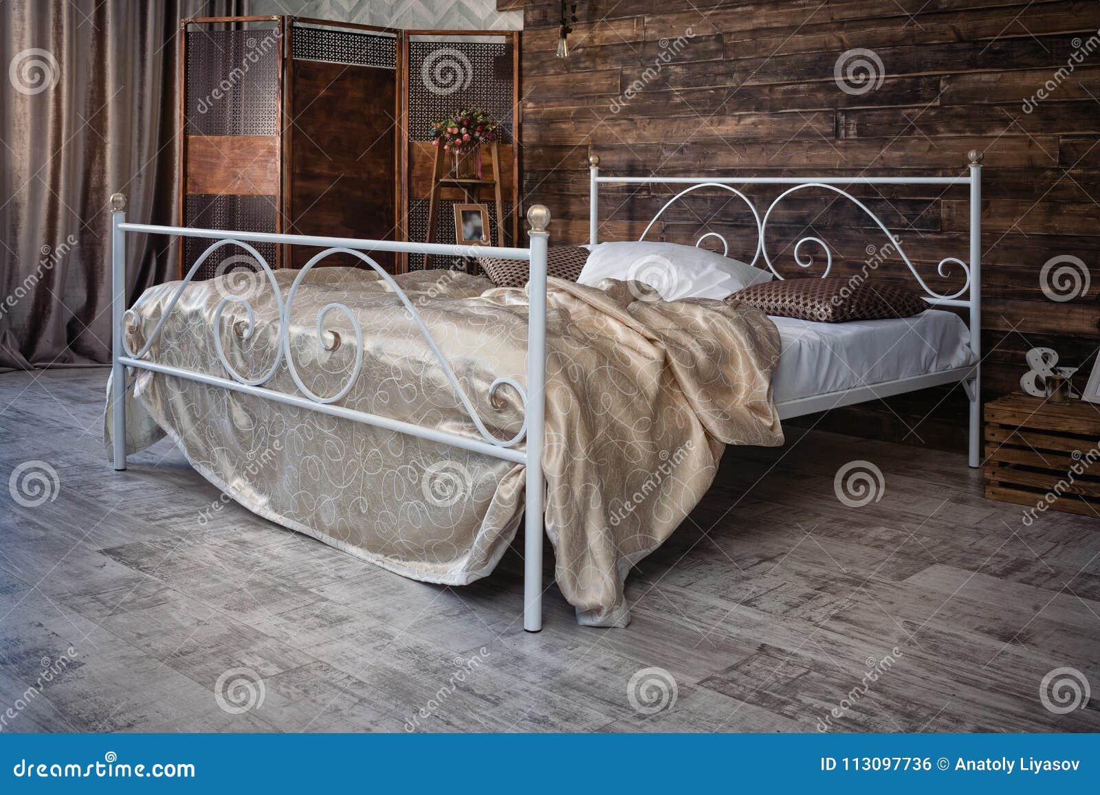 Металлические предметы интерьера прекрасно характеризуют деревенские направления, напоминая о творения искусных мастеров кузнечного дела. В интерьере отменно будет смотреться кровать с эффектом искусственного состаривания или умышленно недокрашенными перилами.