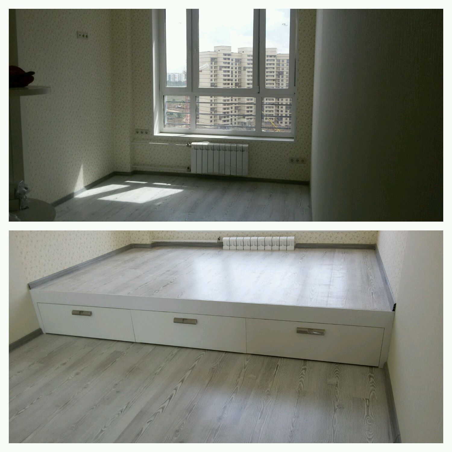 Подиум может быть как низким, в котором расположатся небольшие ящики для мелочей, так и высоким. На высокий подиум забираться придется по ступенькам, которые также могут быть выполнены в виде ящиков. В таком подиуме можно разместить не только отделы для хранения мелочей. Вы сможете полностью заменить им комоды и полки в шкафу.