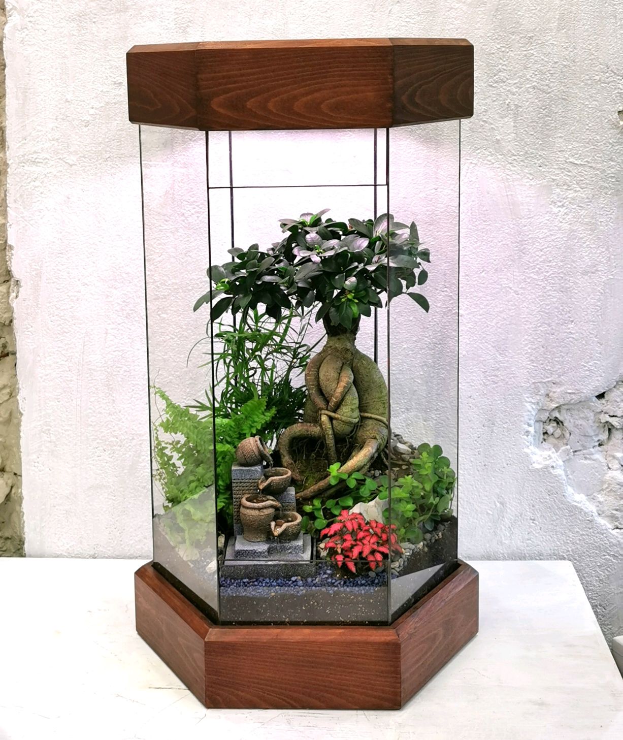 Традиционный миниатюрный сад – закрытый сосуд, обычно с относительно узким горлом, в котором создаётся замкнутая экосистема, способная долго существовать без вмешательства человека. В таких условиях отлично чувствуют себя тропические растения, которым необходимы тепло и влага. В последнее время появилось множество открытых флорариумов разнообразной формы. Они скорее подходят для медленно растущих суккулентов.
