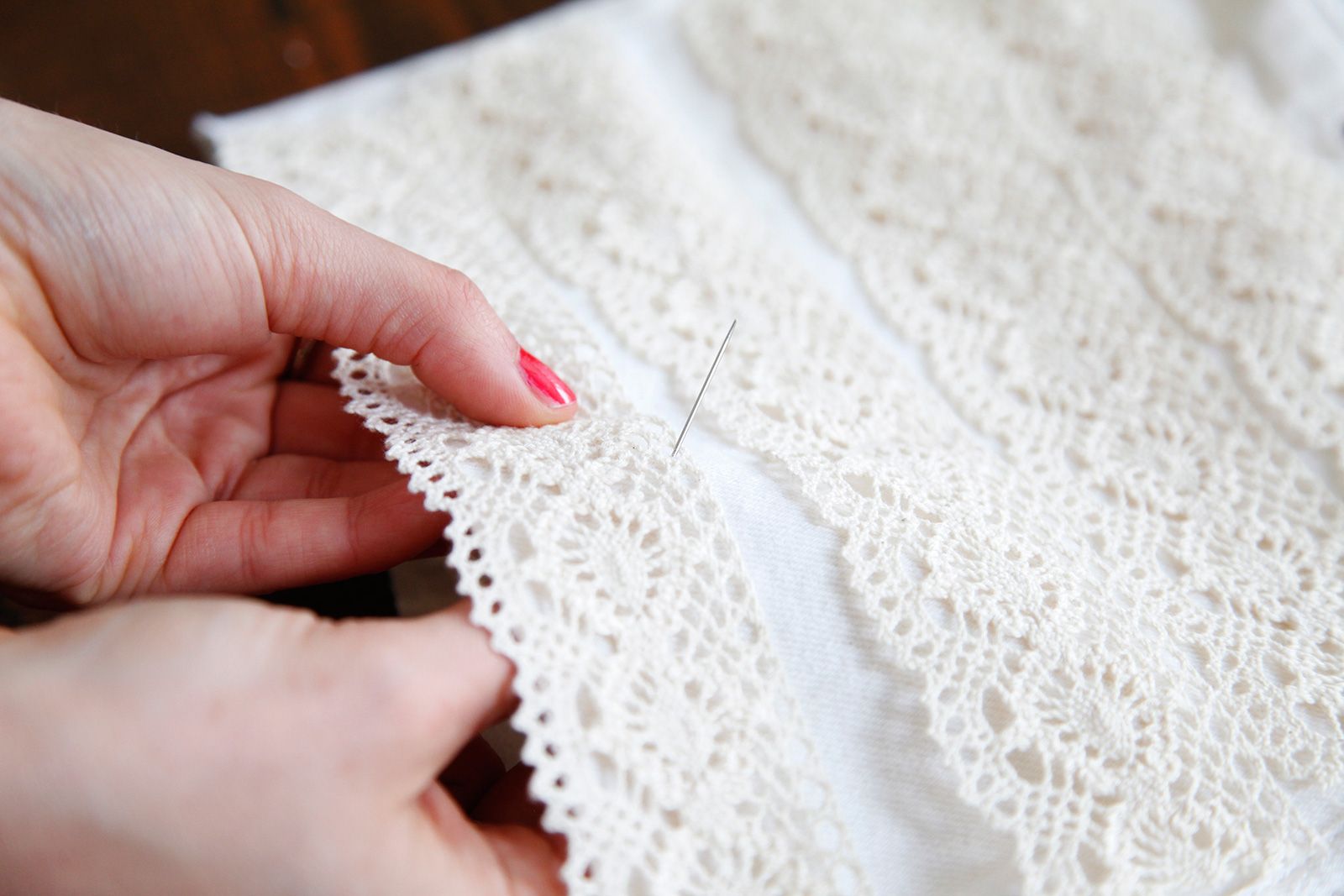 Прикрепите длинный кусок кружева к краю твила / резинки, чтобы он стал плоским