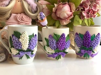 После запекания, зайчик отсоединяется, кружку протираем жидкостью для снятия лака и клеим фигурку на клей. Вот и готова наша кружка — сувенир. Вы можете добавить дополнительный декор кружки цветами.