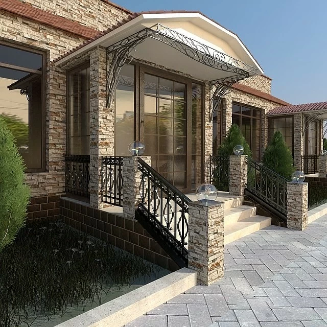 При выборе дизайна входной группы нужно учитывать масштаб сооружения, количество ступенек, форму лестницы, облицовочный материал и рельеф прилегающего участка.