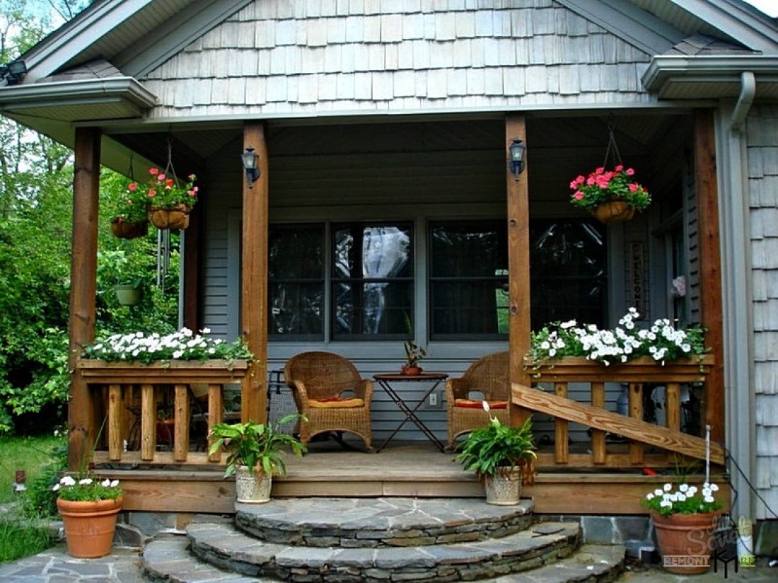 Дачное крыльцо превратится в райский уголок, если оборудовать его как латиноамериканское или средиземноморское патио. Отдайте предпочтение угловым решениям: они защитят патио от непогоды и позволят свободно перемещаться по дому. Стены украсят вьющиеся клематисы, плющ, лимонник или девичий виноград, а по углам площадки поставьте кадки с кипарисом.