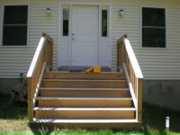 Затем сделайте площадку для крыльца, подготовьте тетивы или косуоры. - Ступени прикрепляйте болтами и гайками и только потом приступайте к установке перил: сначала монтируйте балясины, а потом к ним крепите поручни. Монтаж деревянного крыльца, как правило, завершается установкой козырька.