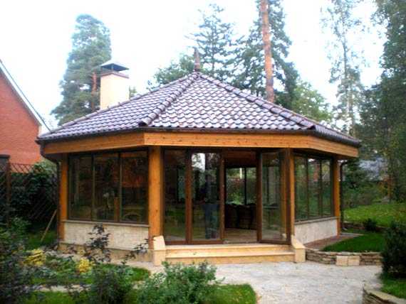 Многоугольные формы пользуются популярности благодаря большому пространству внутри. Шестигранные и восьмиугольные беседки с мангалом – самый распространенный вариант таких конструкций. Как правило, это открытые или полуоткрытые беседки: на полную отделку всех стен требуются большие временные и материальные затраты.