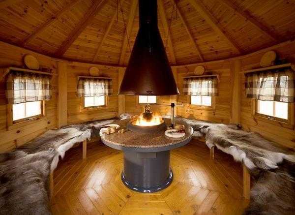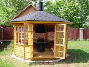 - финская беседка с мангалом чаще всего имеет форму шестигранника и оборудована выпуклой крышей.