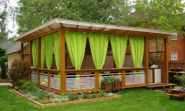 - средиземноморский стиль – максимально простой и лаконичный. В таких беседках используйте дерево без вычурного декора. Допускается простая геометрия, парусные легкие занавески и другие аккуратные детали;