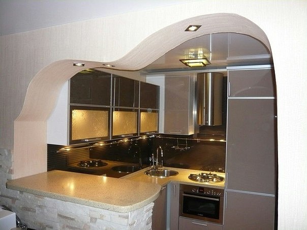 В очень маленьких квартирах с низкими потолками арки будут смотреться не так роскошно, как в широких и просторных помещениях. Но именно арка позволяет преобразить пространство кухни. Её особенностью является то, что она может визуально расширить его и сделать потолок выше. Некоторые говорят о том, что арка на кухне является неприемлемой, поскольку с кухни прокрадываются запахи пищи. Они пропитывают мебель и другие мягкие элементы интерьера.