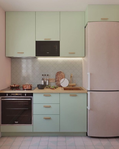 В вопросе техники отдавайте предпочтение встроенным многофункциональным моделям. Любопытное ноу-хау для крохотной кухни –холодильник, интегрированный в один из шкафов: