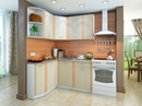 Г-образная форма гарнитура очень распространена среди потребителей. Ее устанавливают вдоль перпендикулярных плоскостей на кухне. Следует подобрать предварительно наиболее подходящий угол, который вместит мебель полностью. Такой гарнитур отличается своими компактными размерами. Его небольшой размер позволяет создать рабочую кухонную зону в малогабаритных квартирах.