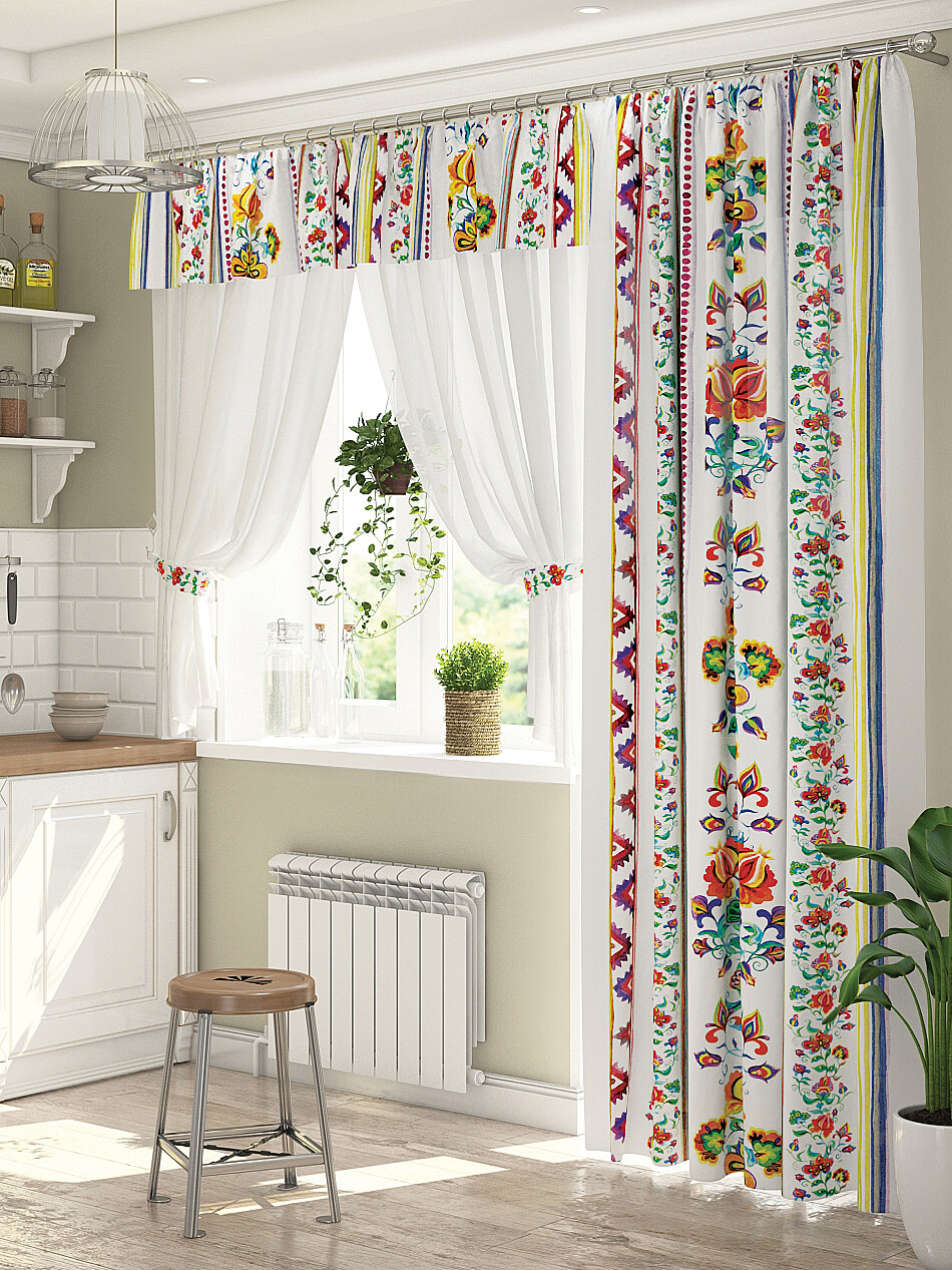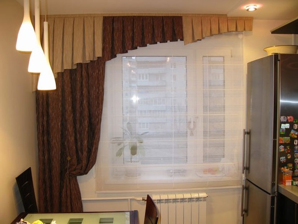 А если батареи нет, или она выполняет декоративную функцию (например, чугунный радиатор в ретро-стиле), то занавеси на этой части окна лучше сделать короткими, это гораздо удобней на кухне.